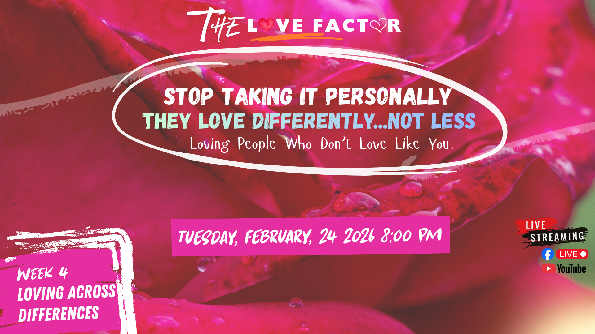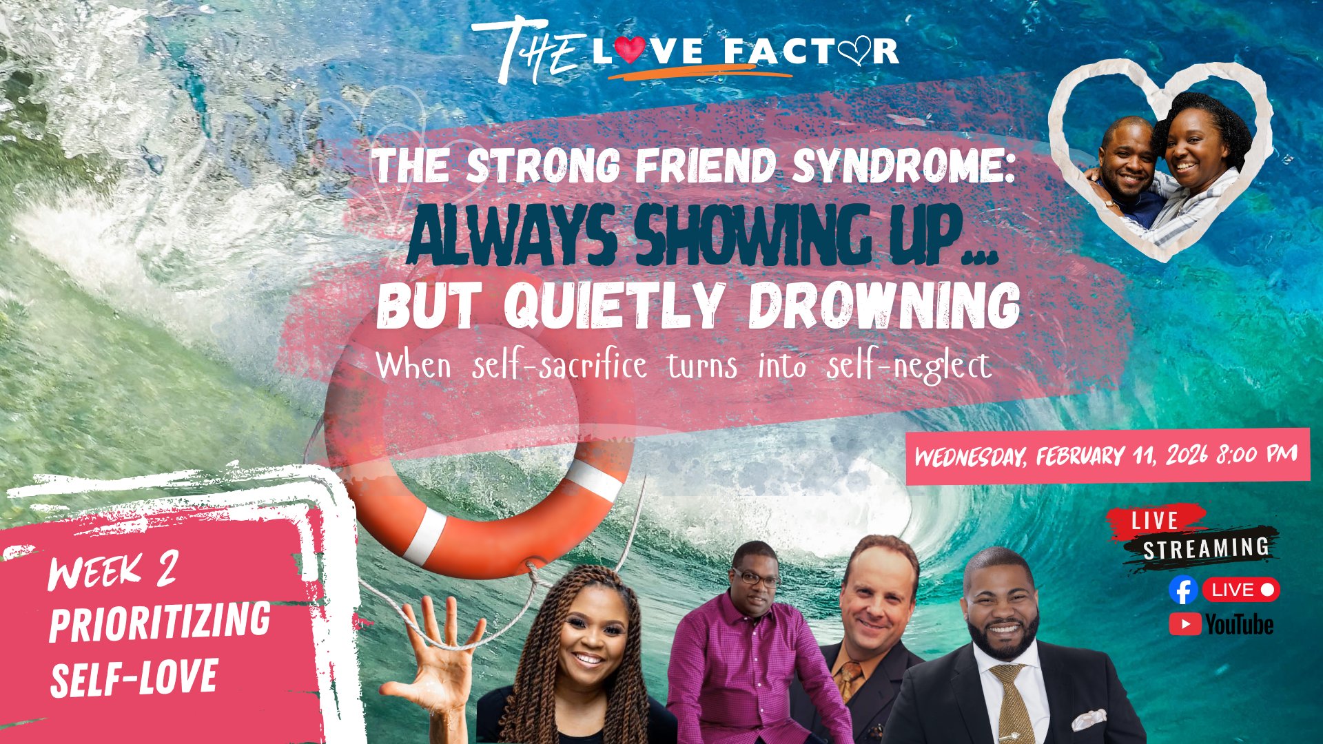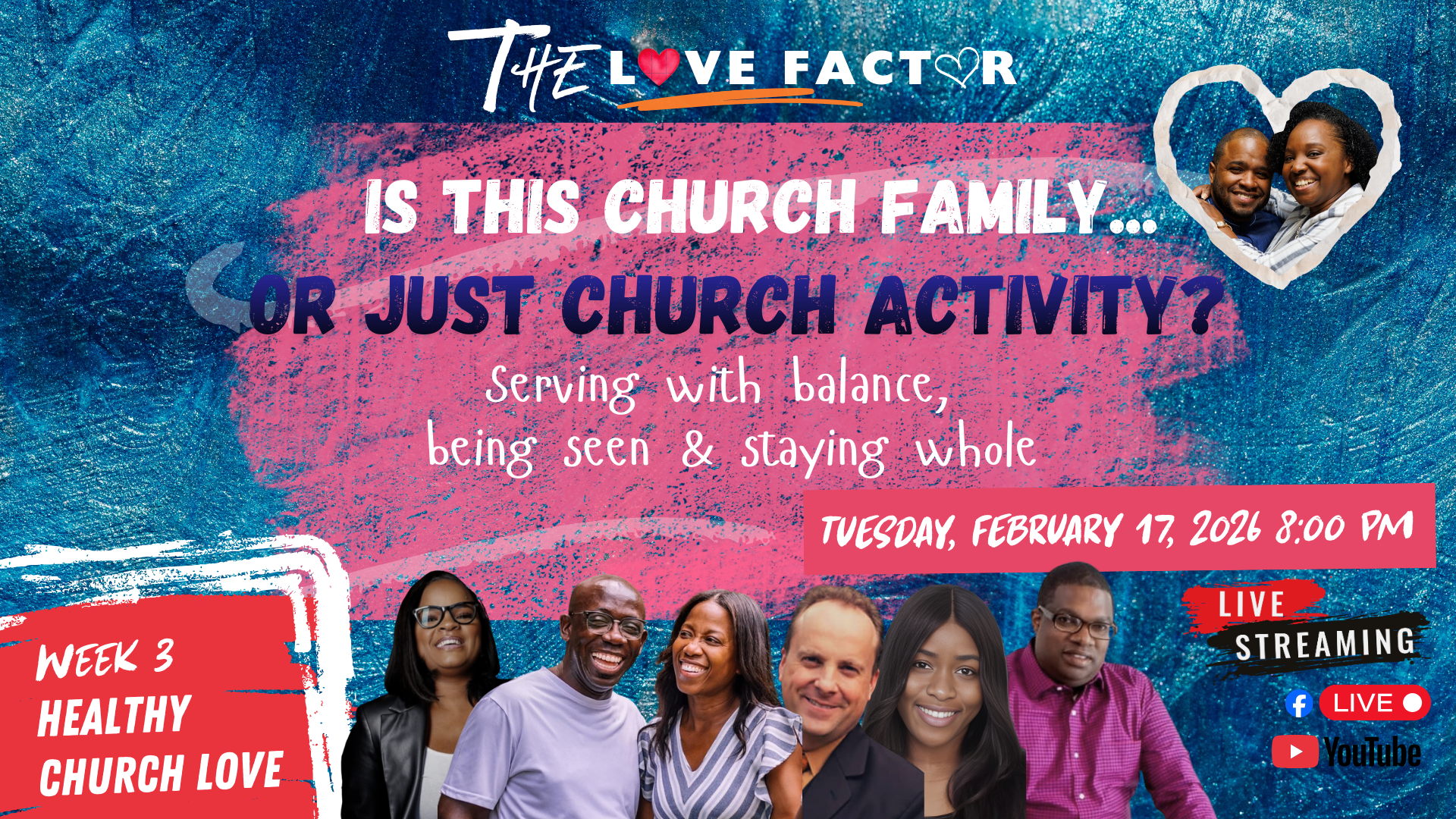 This February, we invite you into The Love Factor, a journey exploring how love shows up in our closest relationships, within ourselves, and in our church. Each Tuesday, we’ll host a live panel discussion featuring honest conversations, real experiences, and practical wisdom about love in today’s world.